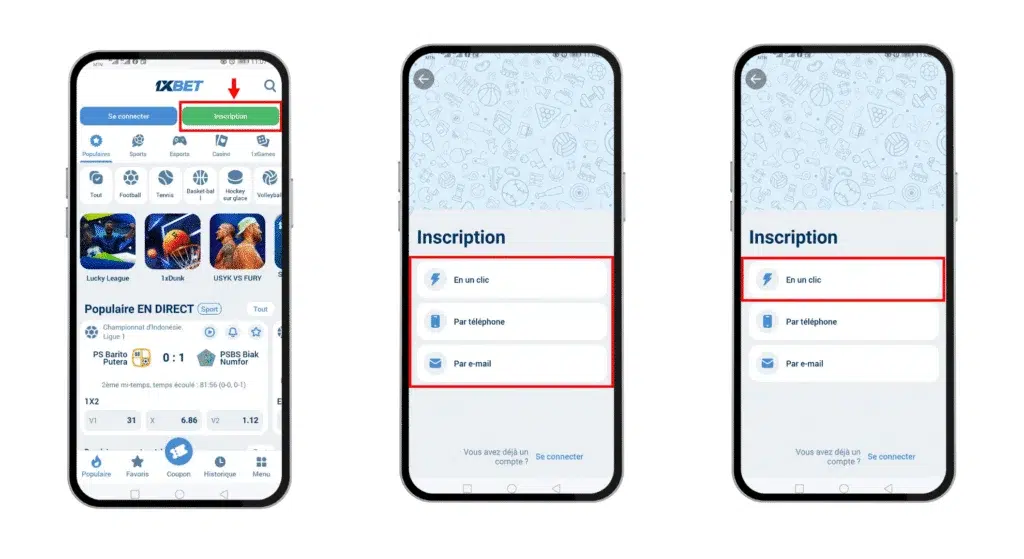 Il existe plusieurs méthodes d’inscription 1xbet : en un clic, par e-mail, via un numéro de téléphone ou grâce aux réseaux sociaux. La méthode en un clic est la plus rapide pour obtenir immédiatement vos identifiants.