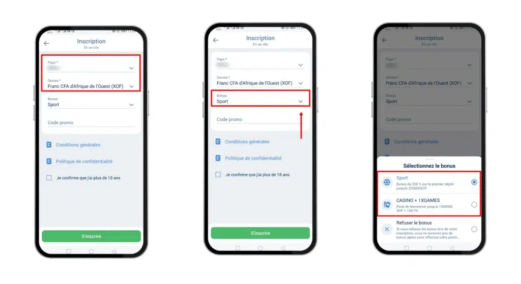 • Sélectionnez le bonus que vous préférez obtenir : paris sportif ou casino.