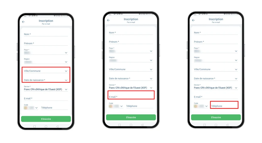 • Sur la fiche d’inscription, vous trouverez déjà renseignés la devise appropriée (XOF) et le code indicatif du pays (229). Renseignez juste votre numéro de téléphone à 10 chiffres.