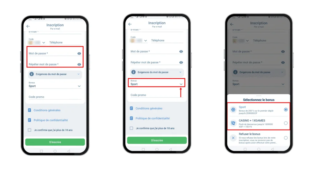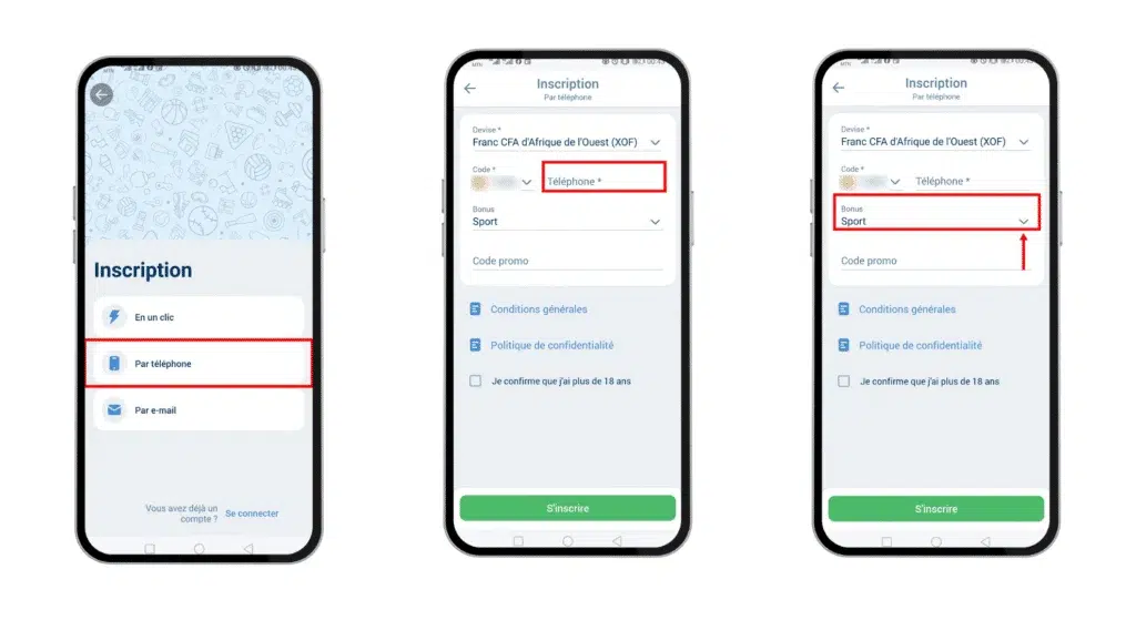 Avec cette méthode, créer un compte 1xbet sur mobile est simple et rapide. Il suffit d’entrer votre numéro de téléphone, ajouter le code promo K20 pour activer le bonus de 200 % sur votre premier dépôt, puis cliquer sur « Envoyer un SMS ».