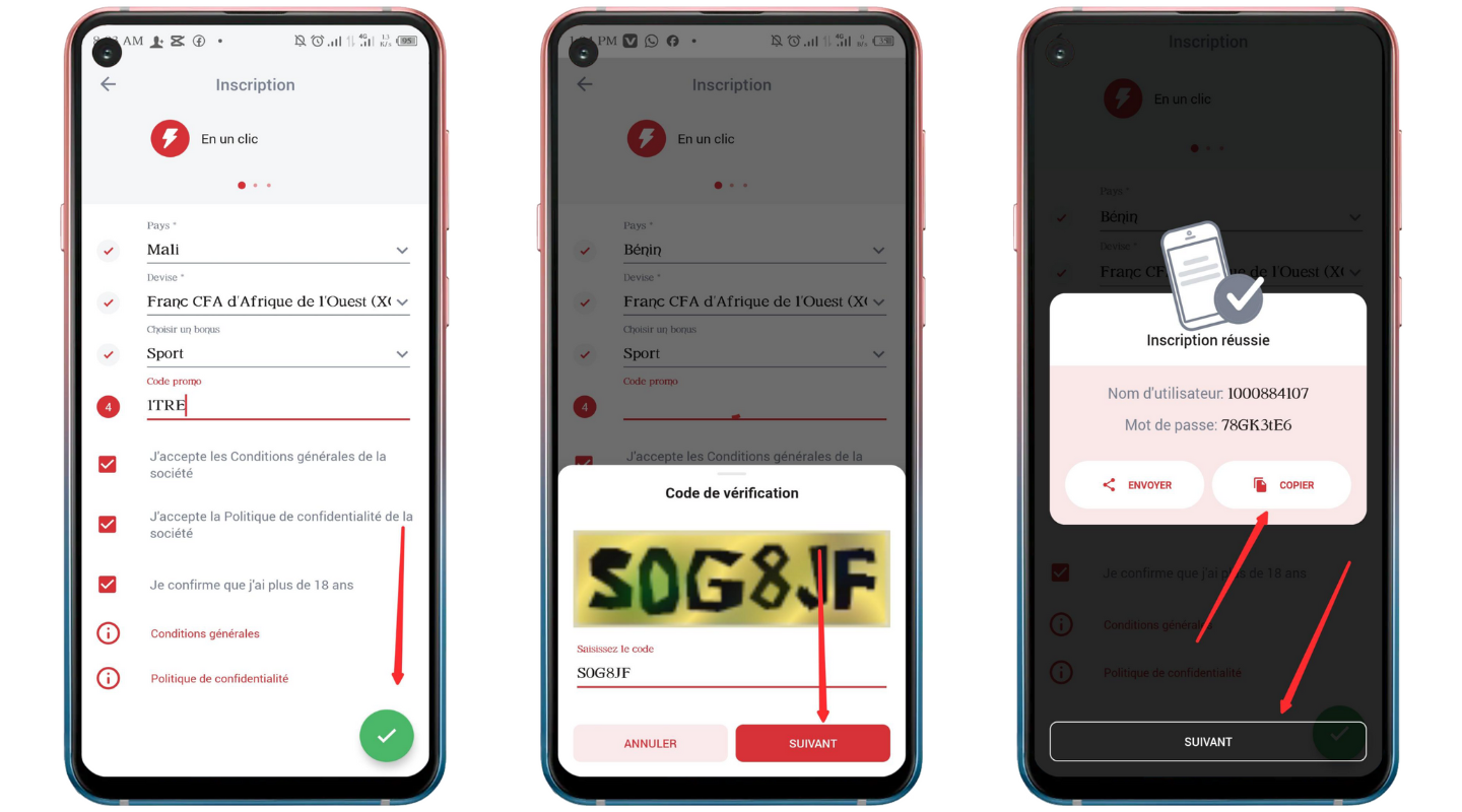 Oui, vous bénéficiez du même bonus de 100% jusqu’à 65 000 XOF sur votre premier dépôt, que ce soit via l’app iOS ou le site web.