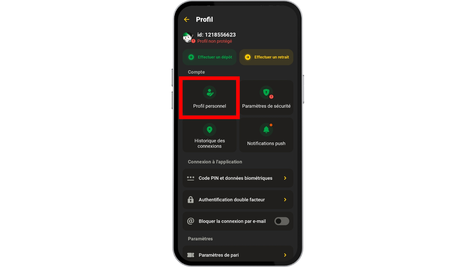 Pour obtenir le bonus AfroPari Cameroun, inscrivez-vous sur la plateforme avec le code promo WINPARIS. Fournissez ensuite toutes les informations demandées dans la section « Mon compte », puis effectuez un dépôt d’au moins 300 francs CFA.