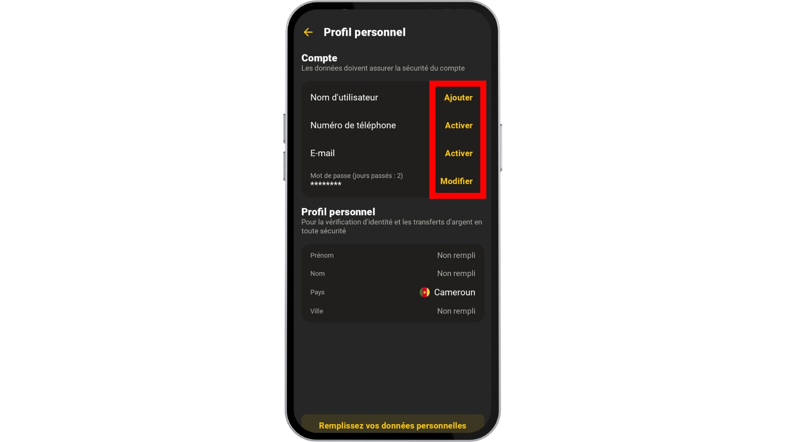 De plus, si à l’inscription vous n’avez pas fourni votre numéro de téléphone et votre adresse e-mail, vous devez le faire avant de passer à la dernière étape de participation au bonus. Pour cela, une fois dans votre profil personnel, cliquez sur les boutons « Activer », puis indiquez dans chaque champ l’information adéquate.