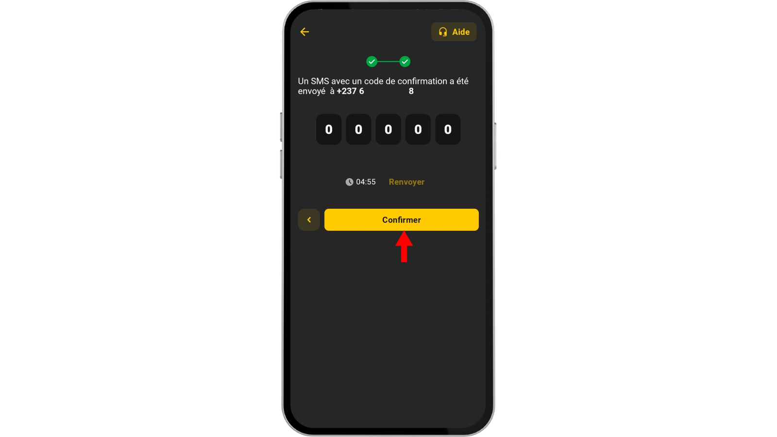 - Confirmez votre numéro de téléphone, en saisissant dans le champ qui s’affiche le code de confirmation reçu par SMS.