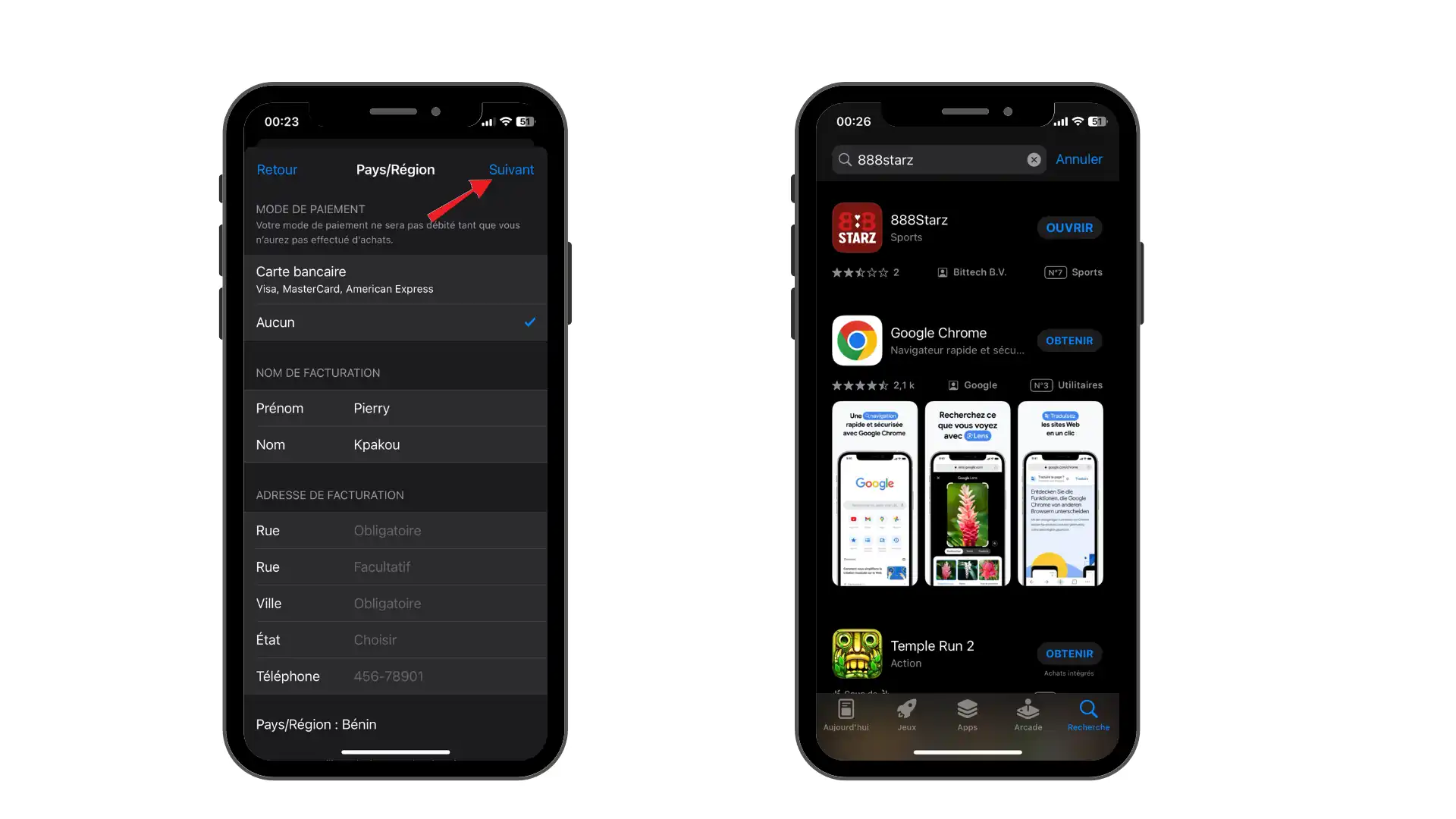 Ensuite, vous devez cliquer sur “Aucun” au niveau de la partie “Cartes bancaires”. Renseignez votre nom et prénom, votre rue, votre état et votre numéro de téléphone avant de cliquer sur ‘terminer”. Allez dans la barre de recherche de votre App store et saisissez “888Starz”. Vous verrez l’icône s’afficher. Cliquez sur “Obtenir”.