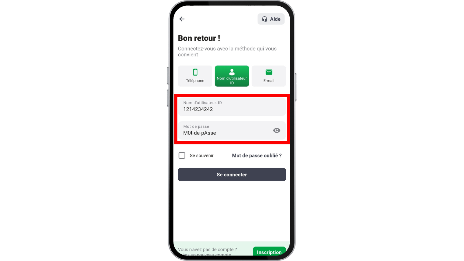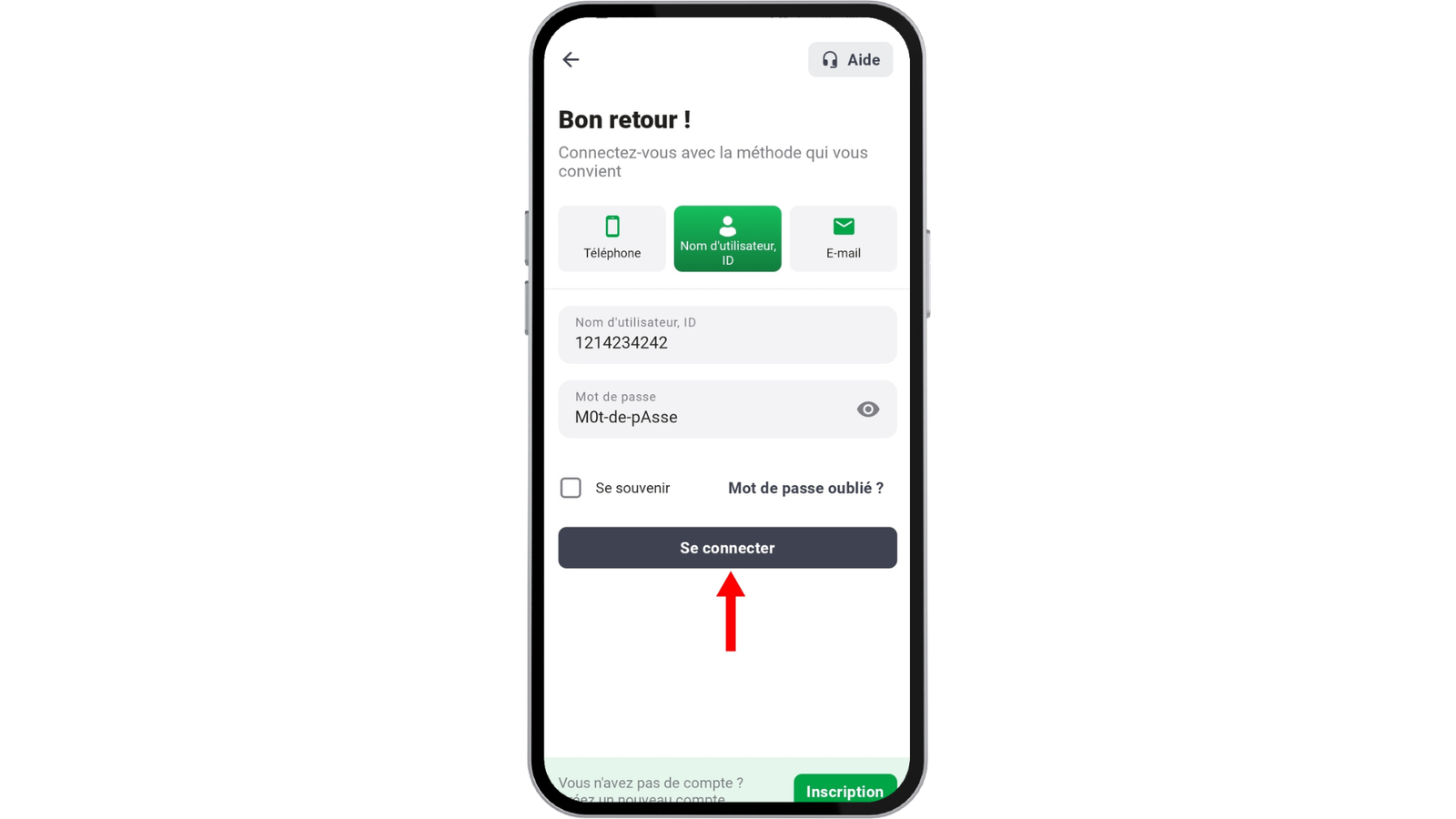 En fonction de la méthode que vous choisissez, vous entrez vos identifiants, à savoir votre numéro de téléphone, votre nom d’utilisateur (ID) ou votre E-mail ainsi que votre mot de passe.