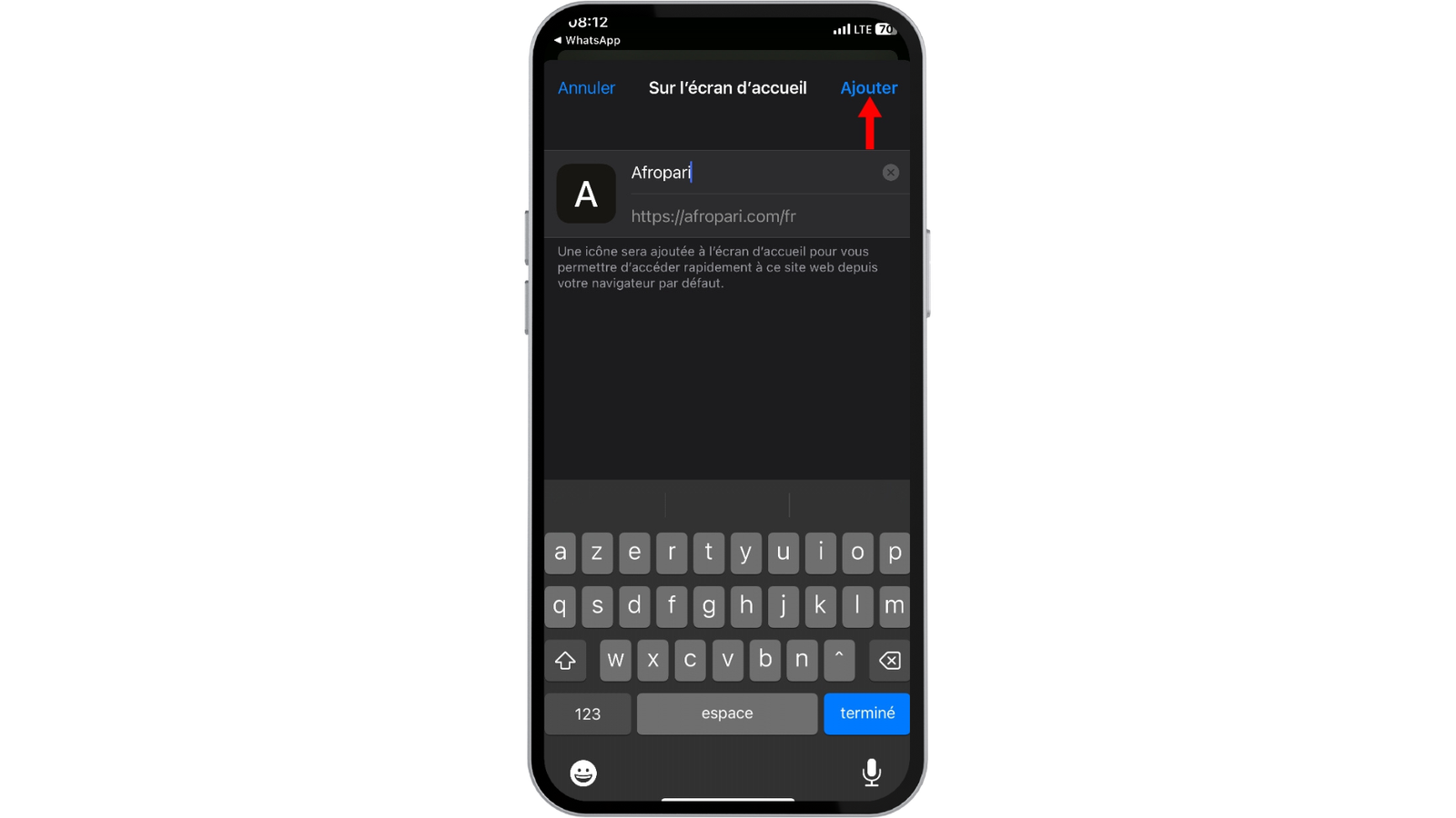 En plus de cliquer sur ce bouton, vous devez au besoin renommer le raccourci. Il suffit ainsi d’utiliser ce raccourci pour avoir un accès rapide à la version mobile d’Afropari Côte d’Ivoire sur votre appareil iOS.