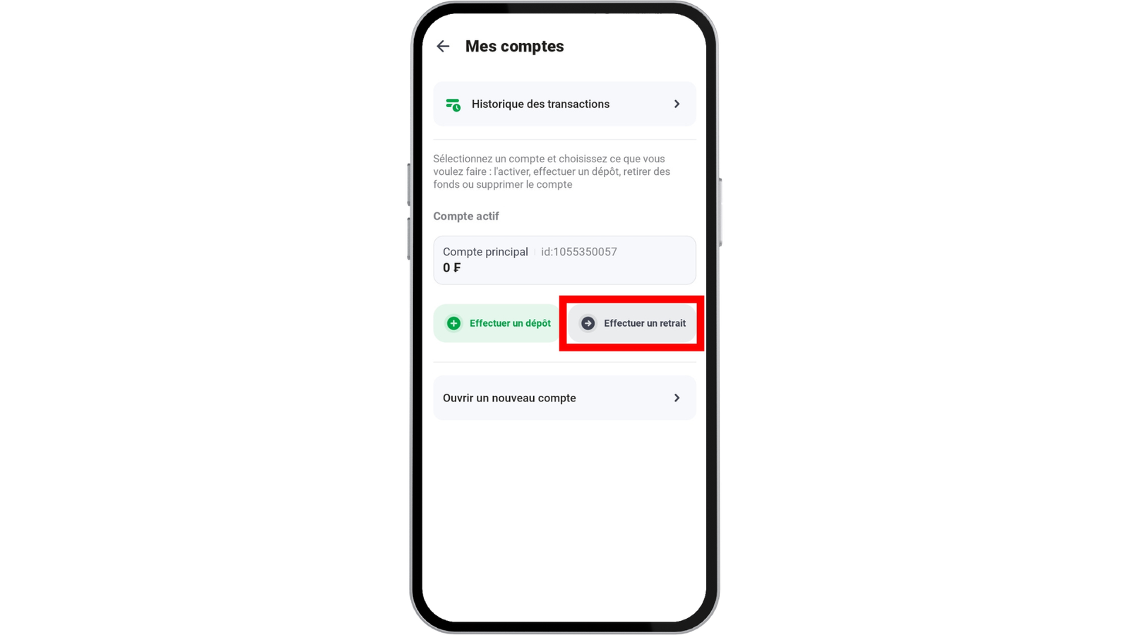 - Choisissez l’option « Effectuer un retrait », représentée par une flèche grise.