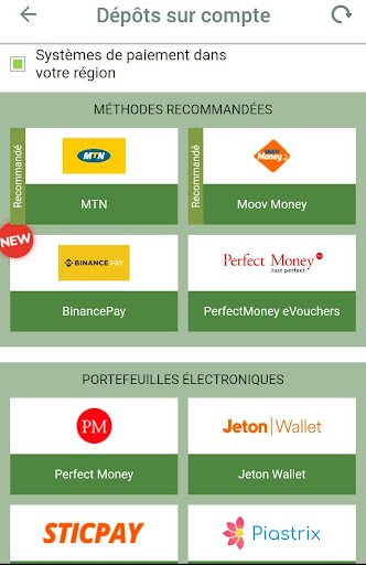 | Moyens de paiement | Orange Money, MTN Money, Perfect Money, etc. |