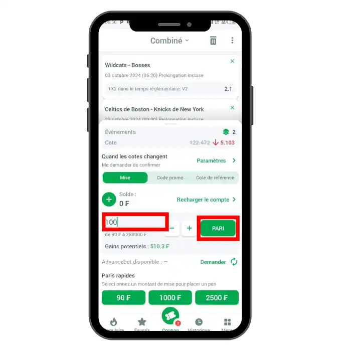 1. Saisissez le montant à parier puis cliquez sur le bouton « Pari »