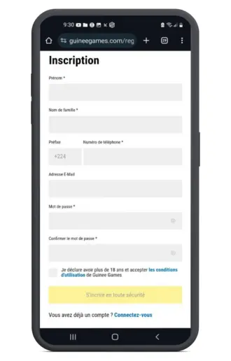 1. Accès au Formulaire d’Inscription: Cliquez sur le bouton s’inscrire ci dessous pour acceder directement au formulaire d’inscription rapide se guinée Games.