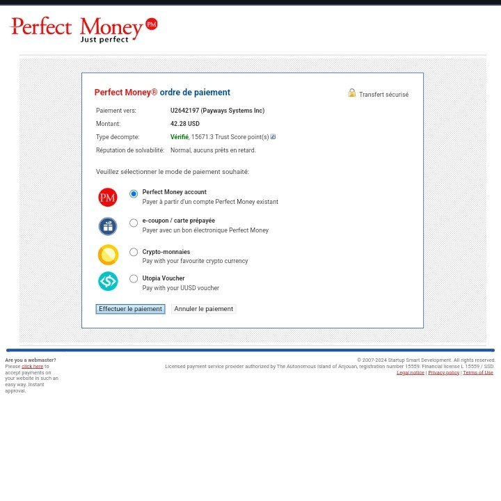 Juste après ce clic, vous serez redirigé vers le site officiel de Perfect Money où il vous sera demandé de choisir un mode de paiement. À ce niveau, vous avez le choix entre une carte prépayée PM, de la cryptomonnaie ou à partir de votre compte principal PM.