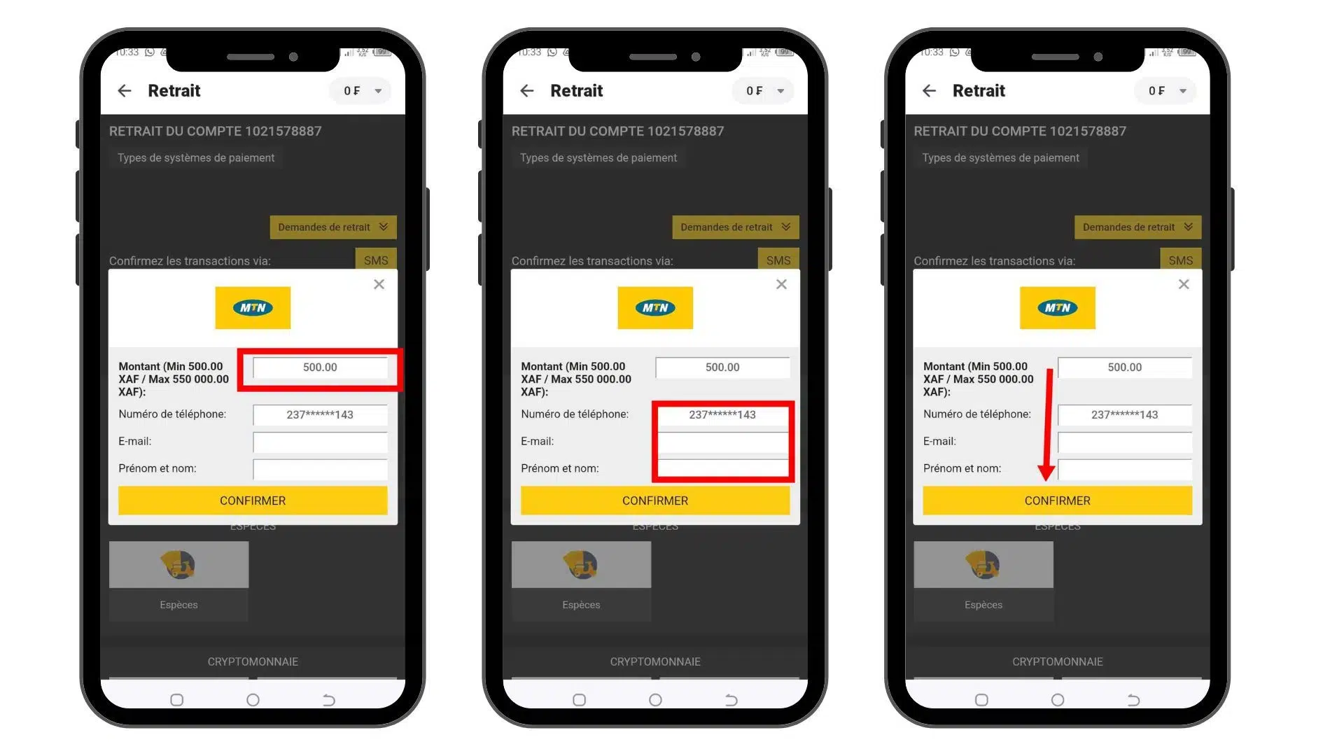 Après avoir rempli toutes les informations nécessaires, cliquez sur le bouton pour valider la transaction. Vous recevrez une confirmation que votre demande de retrait a été prise en compte.