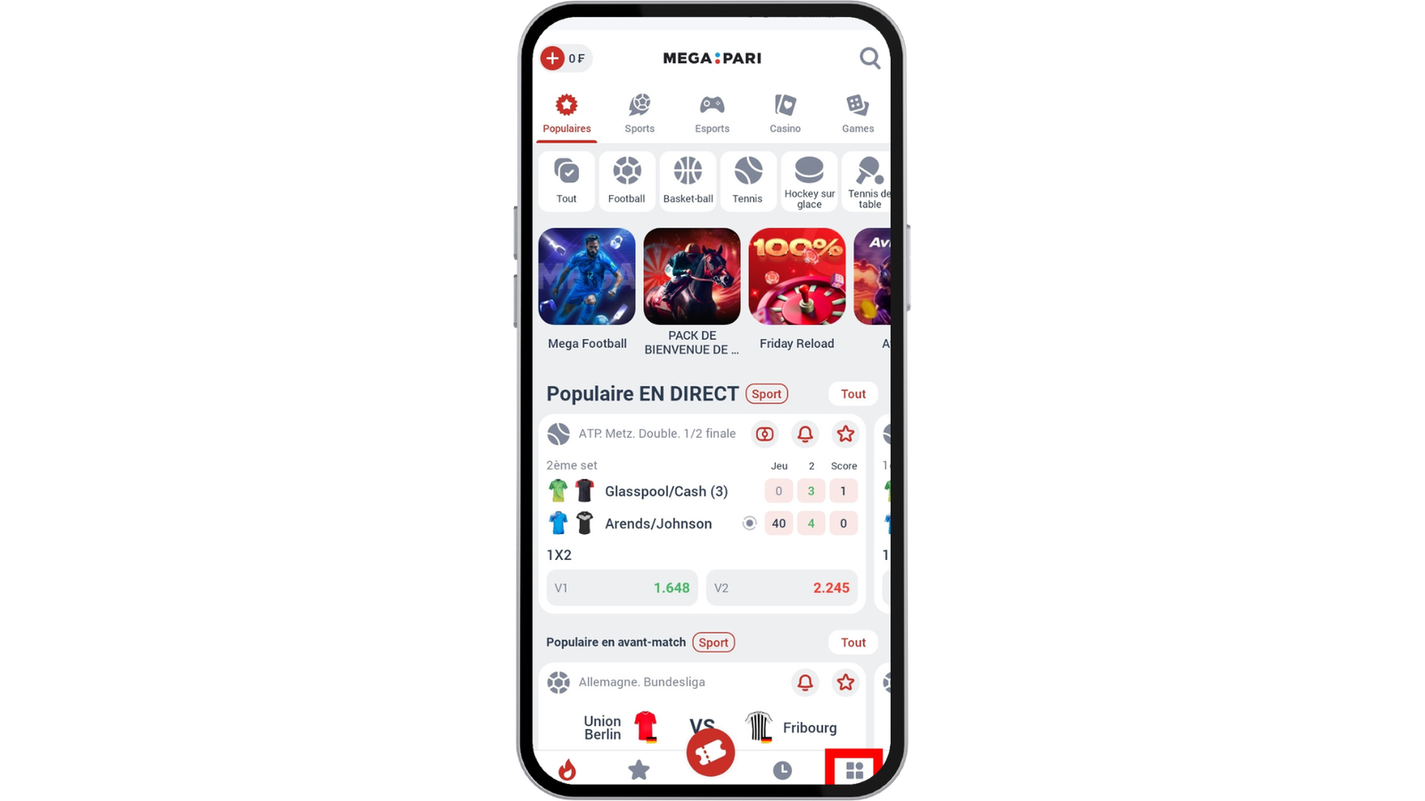 La conception de l’application vous offre plusieurs moyens pour accéder à la page de dépôt. Chez Parier Facile, nous vous conseillons ce qu’il y a de plus simple à faire. Cliquez juste sur le bouton « + » sur la page d’accueil de MegaPari APK.