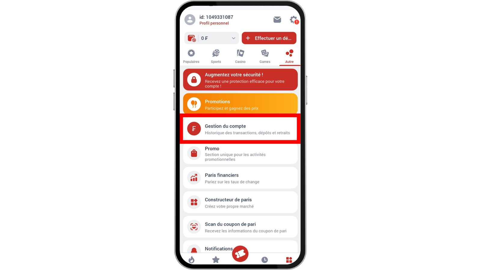 Dans le menu de l’application, plus précisément dans la section « Autre », se trouve une option « Gestion du compte ». Elle vous permet d’accéder à l’historique de vos transactions et d’effectuer des opérations financières.