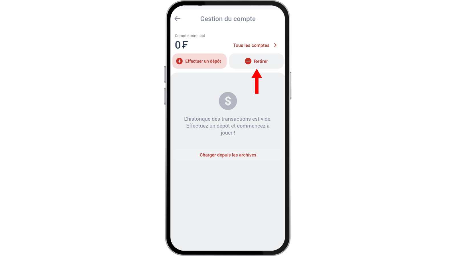 Dans le gestionnaire de compte, seules deux opérations sont possibles : les dépôts et les retraits. Ici, l’option « Retirer » est celle à sélectionner. Elle est représentée par un bouton « – » avec le texte sur un fond gris.