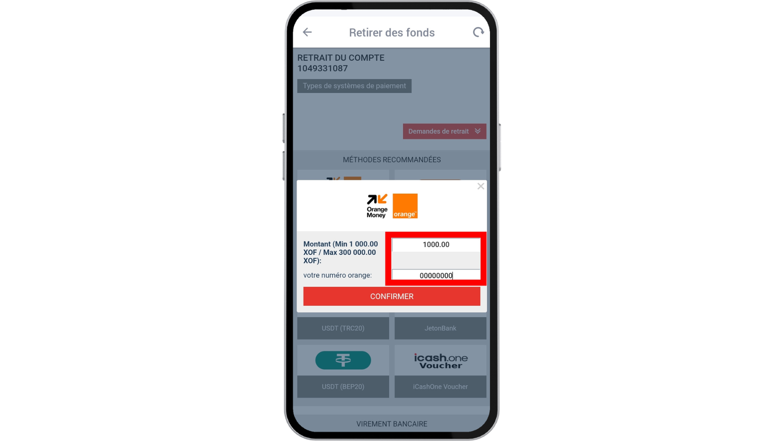 Pour traiter une demande de dépôt, MegaPari a besoin de deux informations : le numéro de votre compte bancaire ou de téléphone et le montant du dépôt. Remplissez convenablement le formulaire qui vous est envoyé à cet effet. Cliquez sur le bouton « Confirmer » pour soumettre la demande.