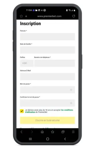 - Vous serez redirigé directement vers le formulaire d’inscription sur le site officiel de premier bet Gabon