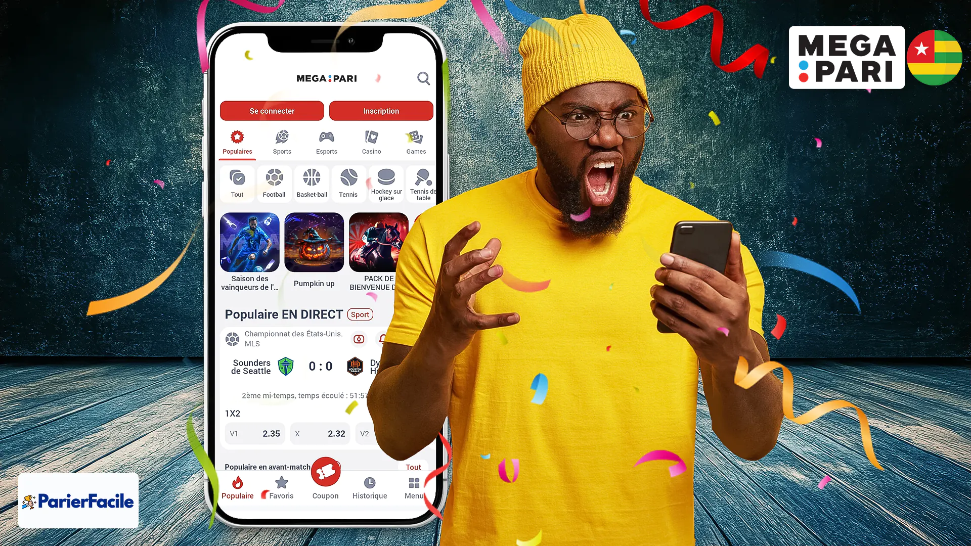 Remplissez les informations requises : nom, pays, date de naissance, numéro de portable, email. Créez un nom d’utilisateur et un mot de passe MegaPari. Ajouter le code promo « 1TRE » pour récevoir jusqu’à 140 000 XOF de bonus lors de votre dépôt. Vous passerez par un court processus de vérification par e-mail. Terminez le processus d’inscription et commencez le jeu.