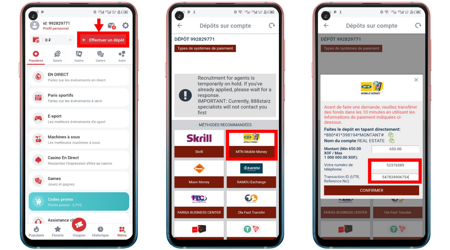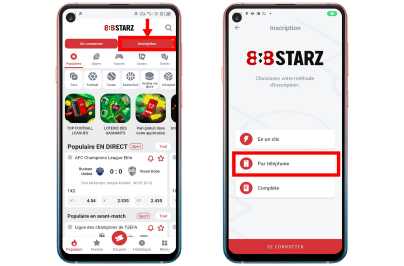 Rendez-vous dans l’application mobile de 888Starz et cliquez sur le bouton « Inscription » de couleur rouge. Choisissez une méthode d’inscription 888Starz Sénégal parmi les 03 présentées (inscription par téléphone).