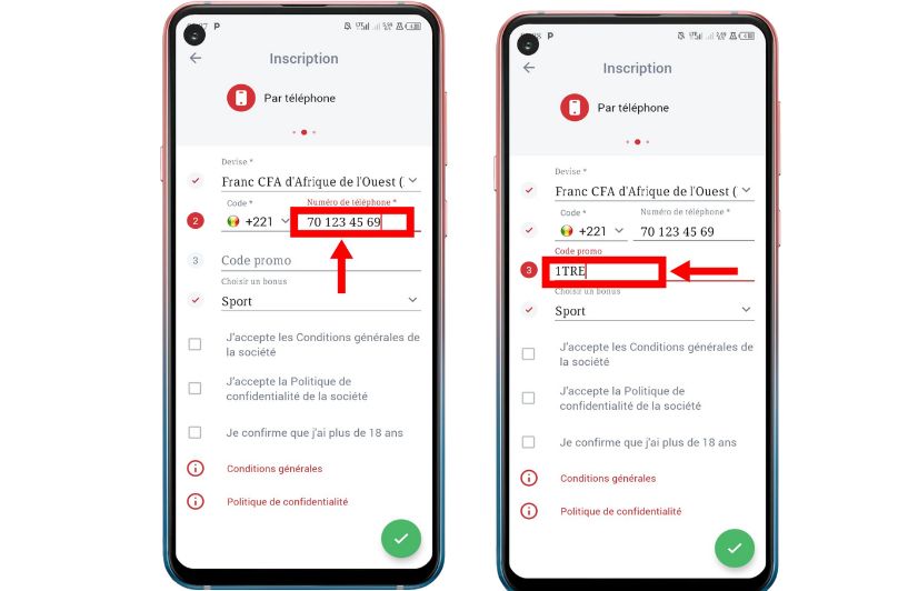 Cochez les trois cases au bas du formulaire pour approuver être un majeur dans un premier temps et en accord avec la politique de 888starz Sénégal dans un second temps. Cliquez sur le bouton de validation (la coche verte) pour valider votre inscription.