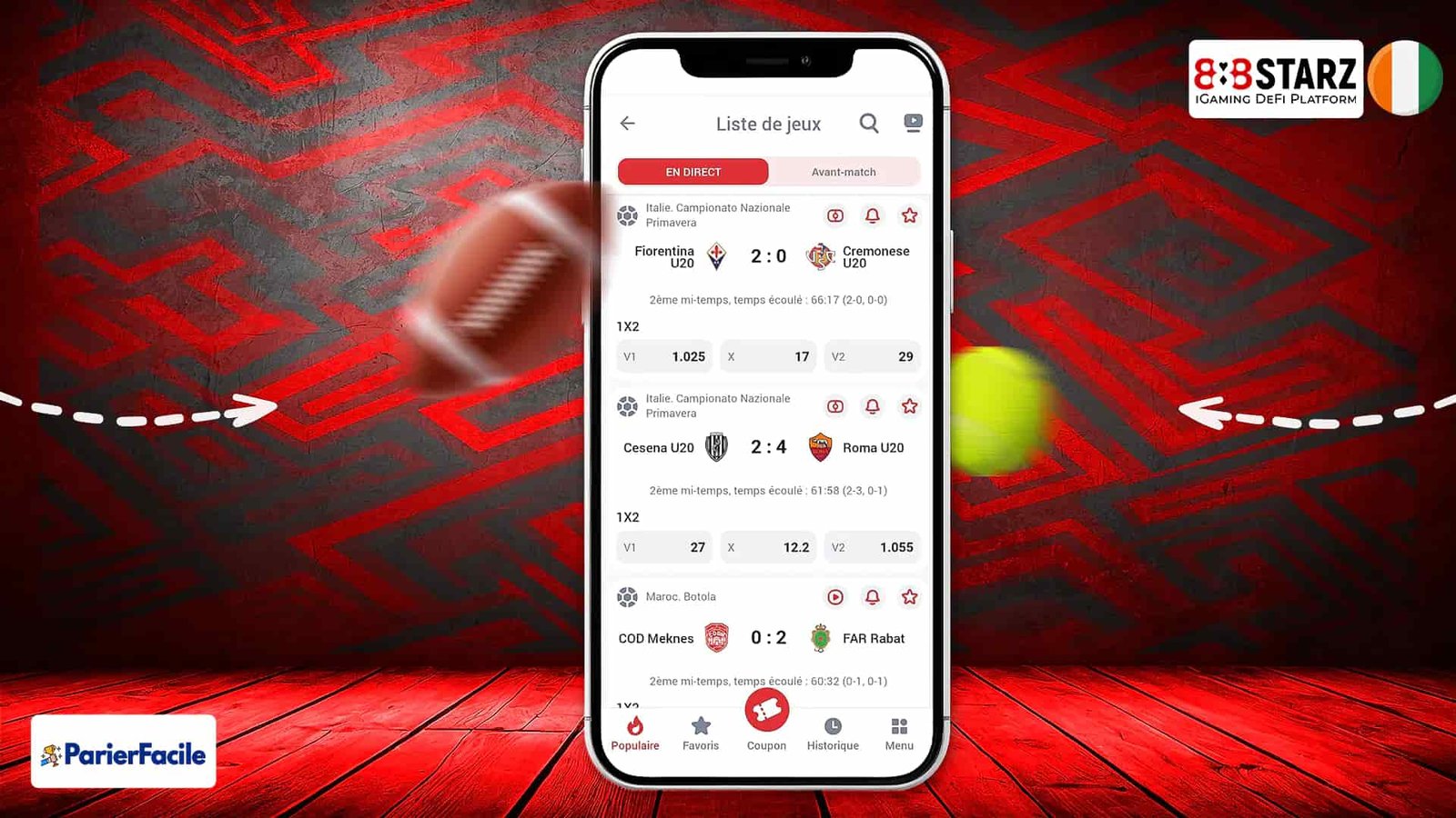 Cliquez sur la section « Avant-match » pour les paris futurs ou « En Direct » pour les événements en cours. L’application affiche toutes les disciplines sportives disponibles.