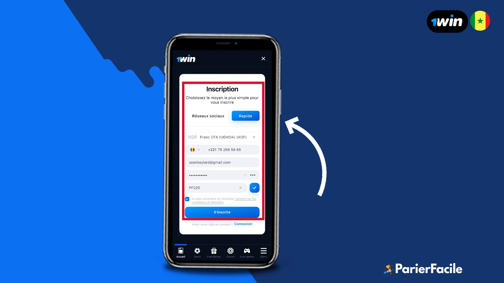 Avant de penser à la connexion, vous devez créer un compte 1win Sénégal. La création de ce dernier se fait rapidement et très facilement. Il suffit de suivre les étapes ci-dessous.