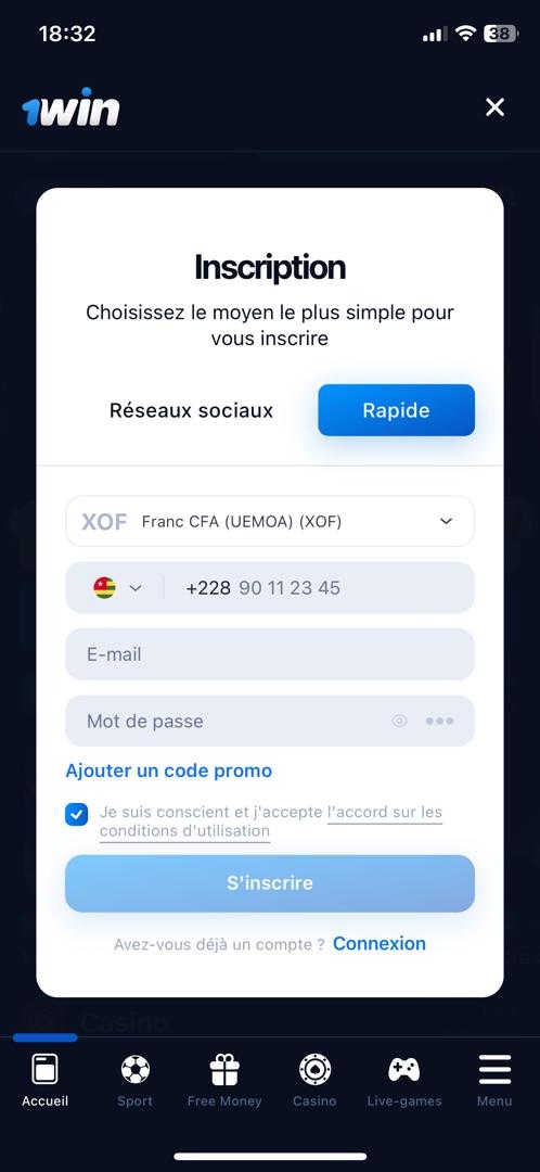Une fois l’application téléchargée et installée, vous pouvez créer un nouveau compte directement depuis l’application. Il existe deux moyens pour s’inscrire sur 1 win iOS: l’inscription rapide et l’inscription via les réseaux sociaux. Pour le type d’inscription que vous avez choisi, suivez les instructions suivantes :