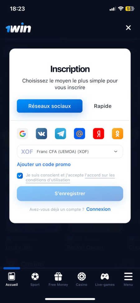Inscription Via Réseaux Sociaux sur 1win iOS