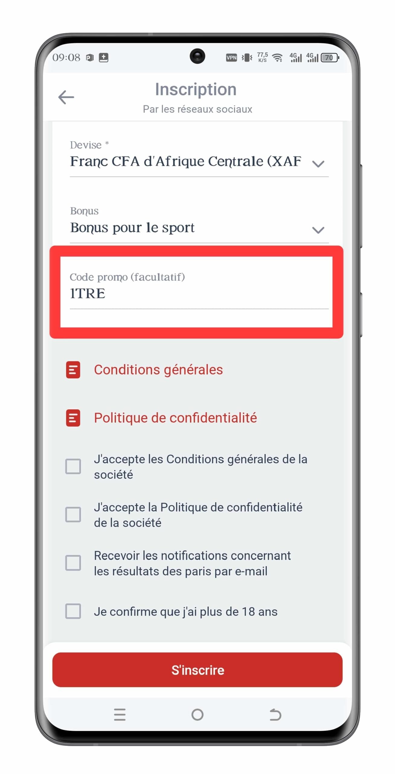 Dans le champ prévu à cet effet, entrez le code promo 1TRE avant de finaliser votre inscription. Ce code vous donne droit à des bonus exclusifs sur Megapari Cameroun.