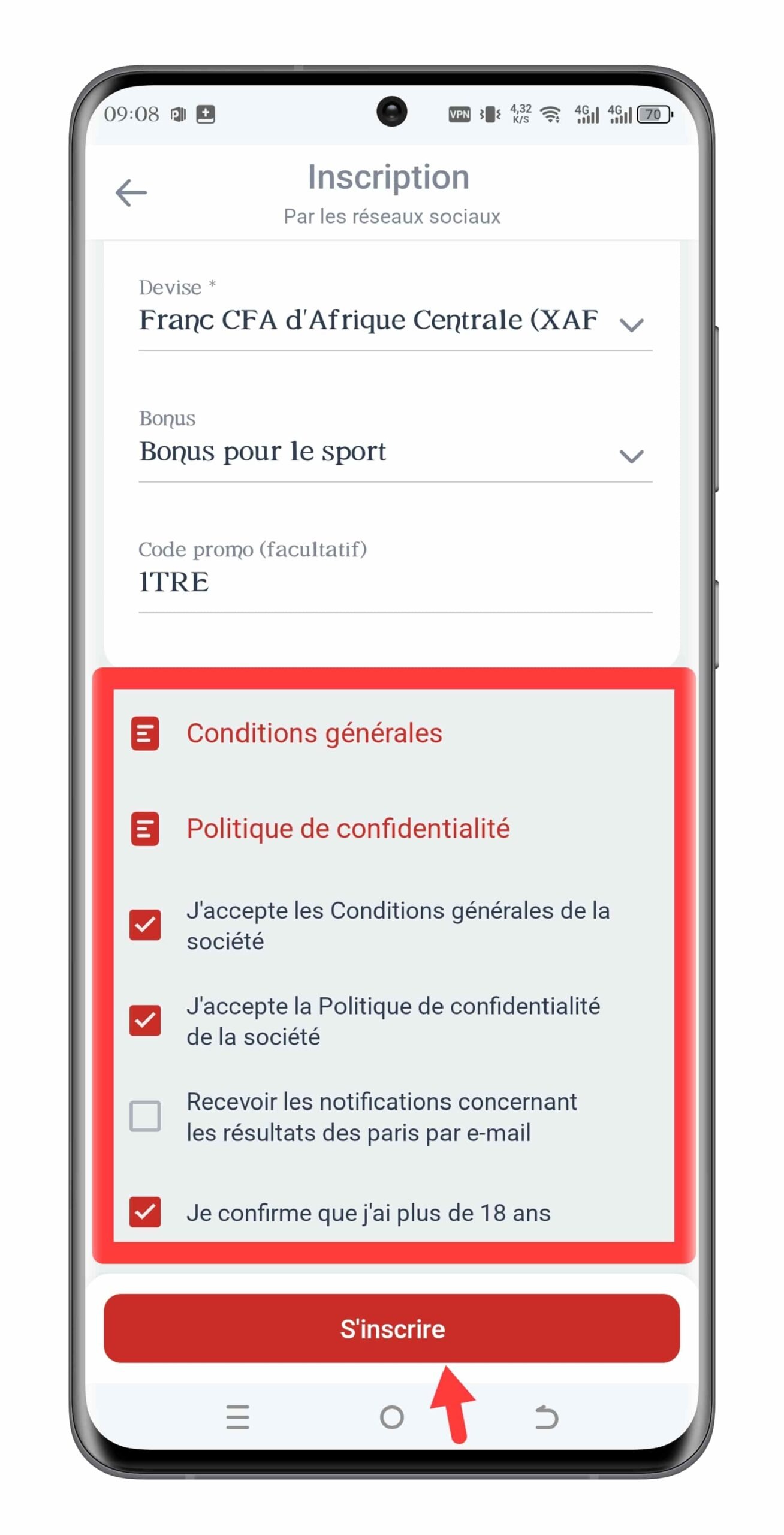 Sélectionnez le type de bonus que vous souhaitez activer : bonus sur les paris sportifs ou bonus casino. Vous ne pouvez en choisir qu’un seul lors de l’inscription, alors optez pour celui qui correspond le mieux à vos envies de jeu.