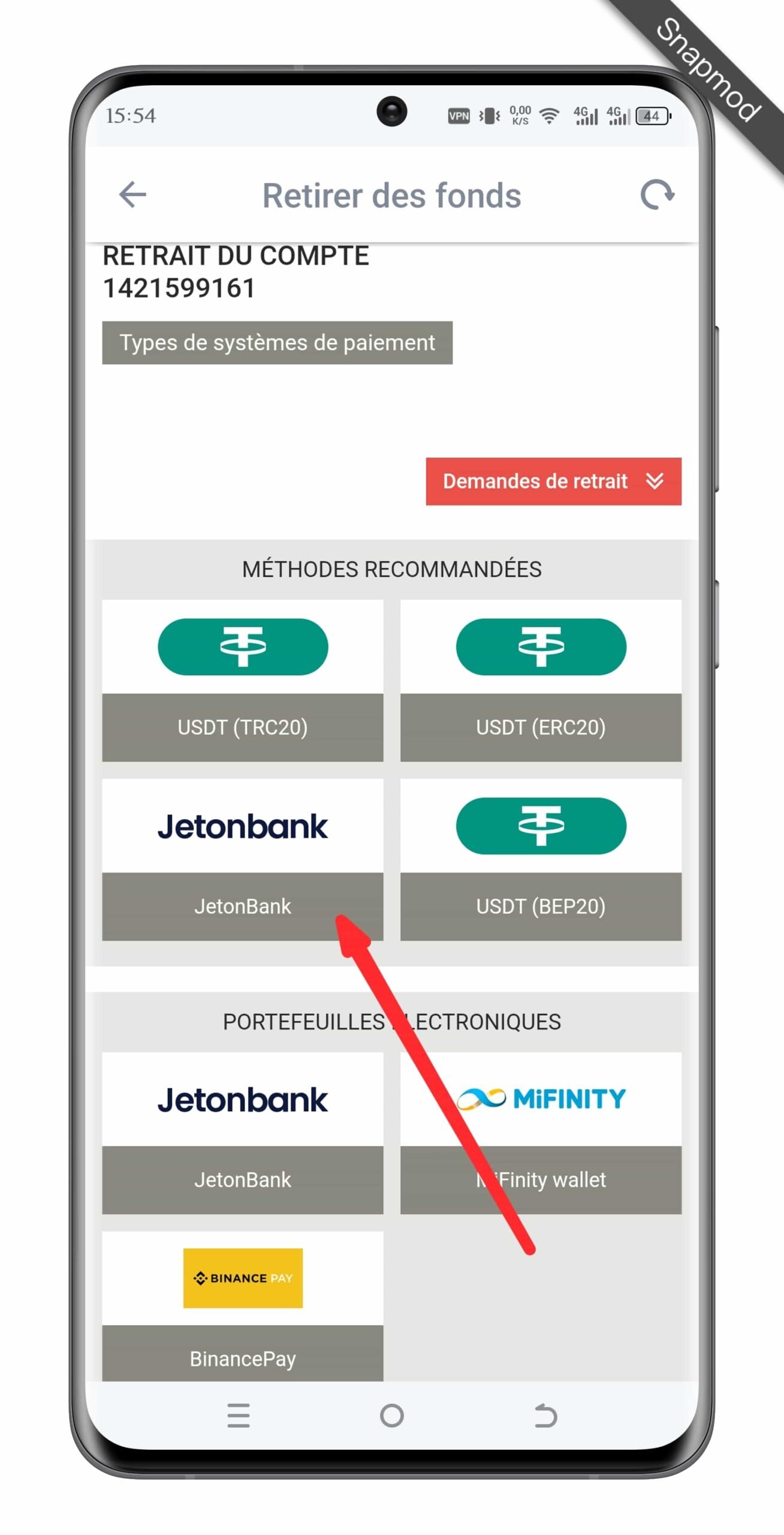 Sélectionnez le mode de retrait de votre choix parmi les options disponibles, par exemple Jetonbank.